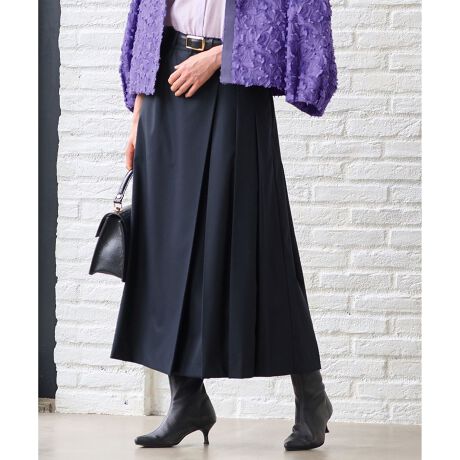 アシンメトリーディティールの大人スカート■デザインしなやかな素材のアシンメトリースカートです。ストレートシルエットの片側にプリーツタックを入れ、歩くたびに裾がゆれるシルエットが美しいミモレ丈のデザインです。さらっとしたタッチで暑さの残る時期から秋の気分を感じていただける1枚です。ブラウスやカットソーとのコーディネートだけでなく、徐々に気温が下がるにつれて、ジレやニットとのコーディネートにも活躍します。※モデル画像はサンプルを使用しております。お届けする商品はポケット無しの仕様となります。詳細画像をご参照ください。■素材ポリエステルウールの混紡糸とポリエステルレーヨンの混紡糸をタテヨコで交織し、ウールのドライタッチと暖かみが特徴です。