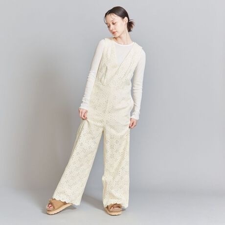 オリジナルのレース柄と表面感のある素材が特徴的なオールインワン。
