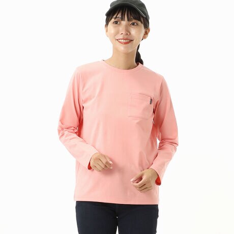 ポリエステル100%の素材ながら、膨らみのあるコットンのような風合いを表現。吸汗速乾、防シワ、抗ピリングといった機能性も備えています。高収縮糸を使用しているため、伸び感があるのも魅力。コットンに比べて軽量かつドライタッチで、着心地の良い仕上がりです。スウェットタイプの長袖Tシャツは、春夏から肌寒い秋口まで1枚で着られ、インナーとしても活用しやすい肉厚感。幅広いシーズンのさまざまなコーディネートに活躍します。UVプロテクト(UPF50+、紫外線カット率95%以上)機能付き。ペットボトルを原料とするリサイクルポリエステルを使用した、環境問題に配慮した商品です。