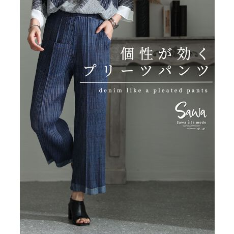 一枚でサマになるオシャレなデザイン。ストレスフリーなウエストゴム仕様で苦しくありません。何と言っても体型カバーに効果的なプリーツデザインが魅力的な一枚。フロント部分の大きなポケットや裾の切り替え、またデニムライクなデザインが大人のおしゃれ心をくすぐります。