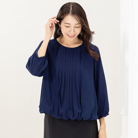 バルーンスリーブがお腹周りを自然にカバー、ふんわりとした胸元タックが女性らしい印象を与えます。