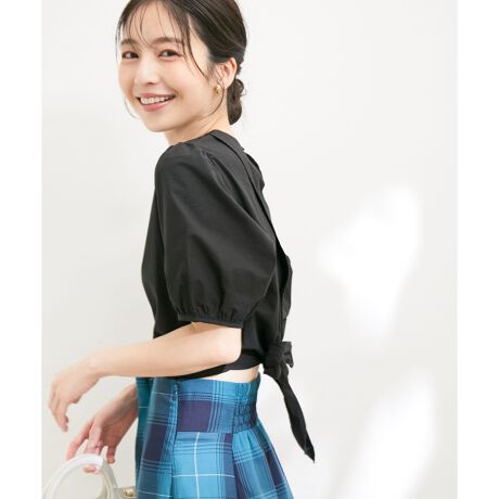 【WEB限定】【洗える】後ろリボンクルーネック短丈ブラウス