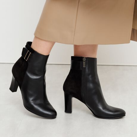 エナメル革を巻いたバックルのベルトをあしらい、クラシックな雰囲気に仕上げたヒールブーツ。