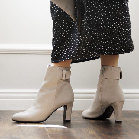 エナメル革を巻いたバックルのベルトをあしらい、クラシックな雰囲気に仕上げたヒールブーツ。