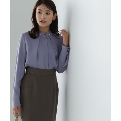 [design & styling]襟ぐりに挟み込んだ華奢な配色パイピングと小さめのゴールドカラーのボタンがアクセントになったブラウス。首元にさり気ないポイントを効かせ、ジャケットインの首元もさみしくならなず、品のいい着こなしに。セットインスリーブですが、トレンドのワイドカフスと袖の前後のタックが立体的に見せてくれる拘りのデザインです。スカートでもパンツでも、スーツスタイルにもサマになる着回しがきくアイテム。ボタンすべて開けることができます。[fabric]スタイリングをキレイに見せてくれる合繊素材を使用。落ち感はありつつも少しハリのあるタッチで襟やカフスがキレイに決まって高見えしてくれるこだわりの素材です。※裏地なし※モデルの着用画像の場合、光の当たり具合により、実際の色味と異なって見えることがございます。色味は、商品単体の画像をご参照ください。