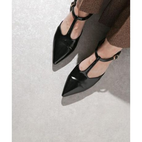 Tストラップデザインがレディな雰囲気漂うフラットパンプス。フラットヒールでありながら、Tストラップとポインテッドトゥが足をすっきりと見せてくれます。ストラップベルトは金具に引っかけるだけだから、脱ぎ履きしやすいのも嬉しいポイントです。