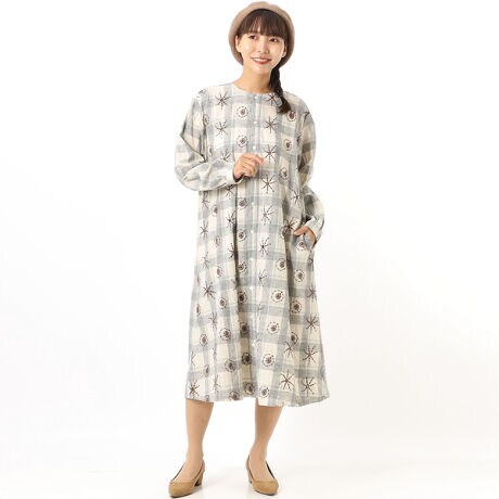 コットンリネンチェックバブルスフラワーボーラーレースノーカラーワンピース(前開き)