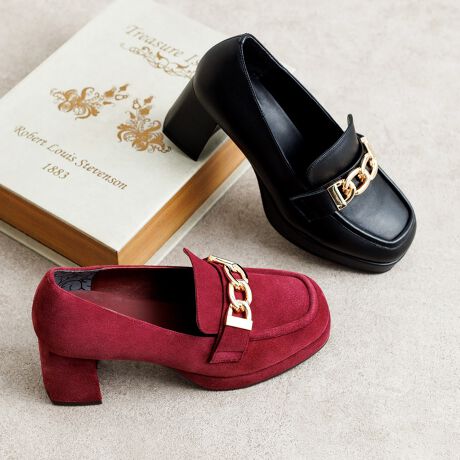 程よいスクエアフォルム+ゴールドのチェーンのデザインが魅力的なヒールアップローファー。