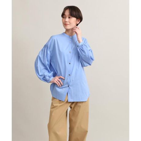 ギャザースリーブがポイントのバンドカラーブラウス。繊細でなめらかな最高級綿のスビン綿を用いた、すっきりとしたクリーンな素材を使用することで上品な印象に。深めのスリットや前後差の付いたヘムラインで1枚でもサマになり、カーディガンやジャンスカのインナーとしても存在感を発揮するアイテムです。・水洗い可《スビン綿MIXローン》タテ糸に最高級綿のスビン綿、ヨコ糸にソロテックス®を使用したソフトで着心地の良いローン素材です。スビン綿の滑らかな肌触りとソロテックス®のソフトかつ軽やかなストレッチ性が特徴です。繊細さがありつつイージーケア性も合わせ持ち、ストレスを感じることなく着用していただけます。使用原料の一部に植物由来成分を用いたソロテックス®は環境配慮型の素材でもあります。※ソロテックス®及びSOLOTEX®は帝人フロンティア株式会社の登録商標です。■サンプル撮影商品■こちらの商品はサンプルでの撮影となっております。実際の商品とは、サイズや色味、素材、デザイン等の仕様が若干変更になる場合がございます。