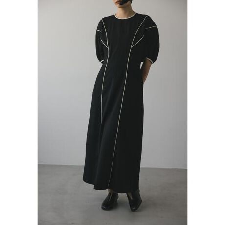 モデル身長168cm(Mサイズ着用)縦に伸びるパイピングでスタイルアップが叶う上品モードなワンピース。ギャザーを施したバック袖で仕上げた立体感のでるフォルムがモードな一枚。ゆったりアームホールとシワになりにくい素材感でリラックスして着用して頂けます。透け感なし、ストレッチややあり。【お手入れ方法】手洗い可