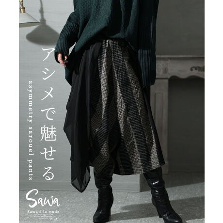 アシメで魅せる変形サルエルパンツです。変形サルエルパンツにあしらわれたシフォン生地がデザインのアクセントに。他にはない個性的な1本です。