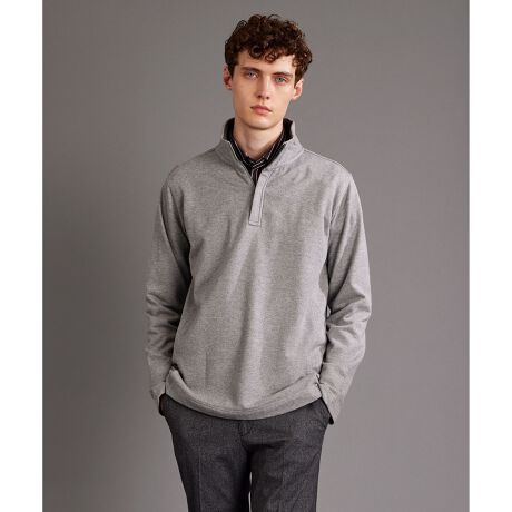 オーガニックコットンハイネックZIPプルオーバー TOPメランジ糸を用いたアブードらしい深みのある色合いのインレー生地は、オーガニックコットンを使用しました。裏毛のトレーナー生地と異なる軽さ、柔らかな肌触りが特徴です。内衿のリブニット使いした比翼前立のハイネックZIPプルオーバーは大人っぽい仕上がりで、シャツインでもTシャツインでも様になるスタイリングを問わない汎用性の高い便利なアイテムです。
