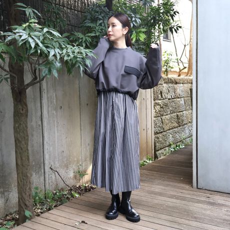 [型番:137816]ショート丈のプルオーバーです。袖にタフタを使用しゴムを通すことで搾れるようにしています。シャツのレイヤードスタイルがおすすめです!