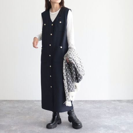 ・ワンピースとしてはもちろん、前を開けてジレとしても着用いただけるのでコーディネートの幅が広がります