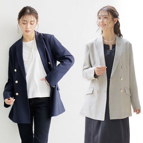 ・お仕事スタイルにはキレイめブラウスやボトム、ワンピース合わせがおすすめ。ボックスシルエットとダブル合わせはマニッシュな印象なのでアクセサリーやシューズでフェミニンさをプラスするとギャップが旬なコーデに。セレモニーシーンにもおすすめです。