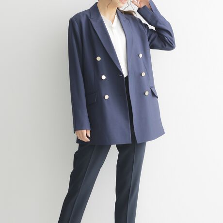 ・お仕事スタイルにはキレイめブラウスやボトム、ワンピース合わせがおすすめ。ボックスシルエットとダブル合わせはマニッシュな印象なのでアクセサリーやシューズでフェミニンさをプラスするとギャップが旬なコーデに。セレモニーシーンにもおすすめです。