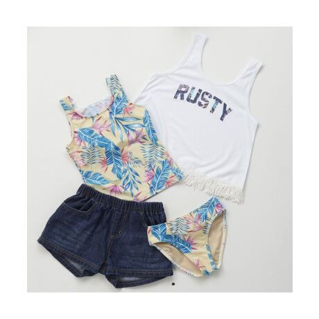 [型番:68400803]タンキニでお腹が隠れて、フリルタンク、デニムショーツ、水着の4点セット。RUSTYらしい華やかな柄がとっても可愛い。メーカー品番:962803