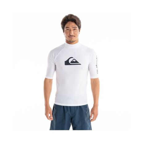 リサイクルポリエステルを使用した、縦横に強い伸縮性を持つトリコット素材の半袖ラッシュガード。最高値UPF50+で紫外線から肌を守り、高い速乾性を併せ持ちます。フロントのロゴは、単色とシーズンストーリーを反映したボードショーツ柄の2パターン。左肩にはロゴタイプをプリント。シルエットはレギュラーフィット。ブルーは五十嵐カノアのボードショーツインスパイアモデル。