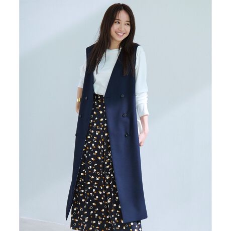 着こなしの幅がひろがるロングジレはジャンパースカート風にも使える2WAY仕様。ノーカラーが首元をすっきりと見せてくれます。フロントのダブルボタンは着こなしのアクセントに。さっと羽織るだけできちんと見えつつ体形カバーにもなる便利なアイテムです。シャツはもちろん、ニットなど季節が進むに連れて様々なスタイリングを楽しんでいただけます。カラーは上品なネイビー(#075)とチャコールグレー(#004)の2色展開です。