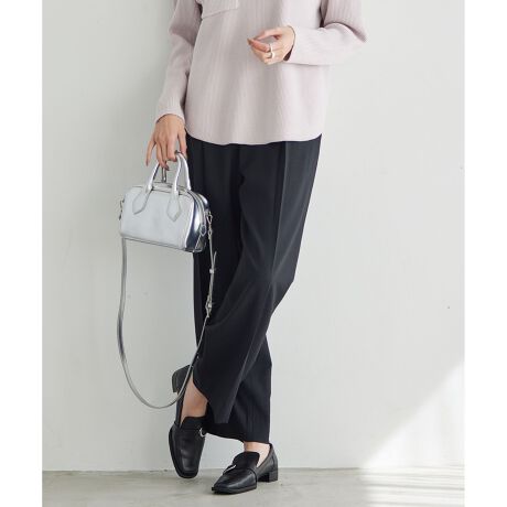 ■デザイン角カンベルトデザインのセンタープレス入りのタックパンツです。ウエストのタックによりヒップ周りに程良いゆとりが生まれ、ボディラインを拾いにくいフォルムのパンツです。ウエスト部分はゴム内蔵のスマートバック仕様でラクな履き心地なのも嬉しいポイントです。同素材のジャケットと合わせてセットアップはもちろん、単品でも着回しの利くアイテムです。