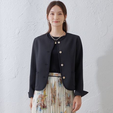 在感がありながら上品な質感を持つ立体感のある膨れジャカードのノーカラージャケットです。膨らみがありつつ、素材感は軽やかでさらりと羽織れ、旬ムードを演出してくれます。高級感を演出するゴールド釦やニットのトリミングを効かせて、秋冬らしさをプラスしました。裏地のドットもさりげないポイントになっており、表地と色差をつけた配色で細部まで拘ったデザインです。