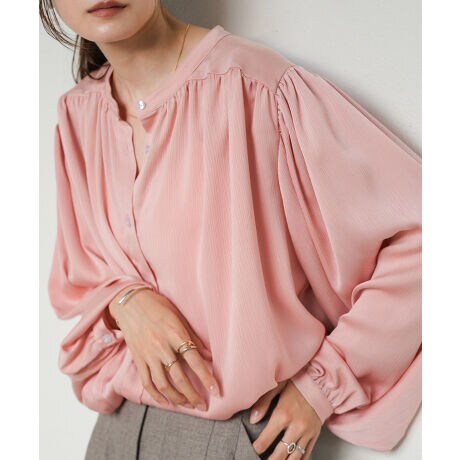 ギャザーがふんだんに入ったカーディガンとしても使えるブラウスの登場です。袖のボリューム感にもこだわり、ふんわりエアリー感が出る1枚になっています。着丈の長さはブラウスとしてボトムにインしても、羽織として着用しても着やすいように調整しました。