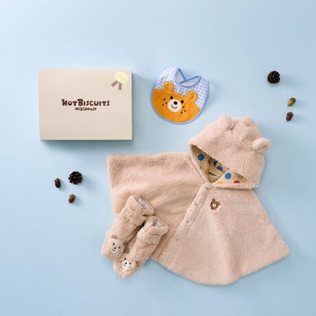 シープボア素材のかわいいマントとブーティ、スタイのセットです。