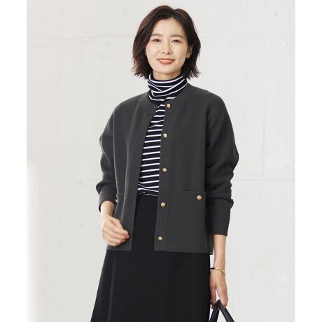 表面の繊細な凹凸が上品な印象のニットカーディガン。程良いハリがありながらも柔らかさの残る編地に、ゴールドボタンを施しジャケットライクに仕上げました。季節の変わり目の温度調節や、軽めのアウターとしても活躍するアイテムです。実用的なポケット付きで、カジュアルなスタイルにもきれいめのスタイルにも使えます。同素材のスカートとセットアップでの着用おすすめ。ニットならではの固くなりすぎないスタイリングでコートも重ねやすく、お食事会などのお出かけスタイルに羽織っても品よくきまります。