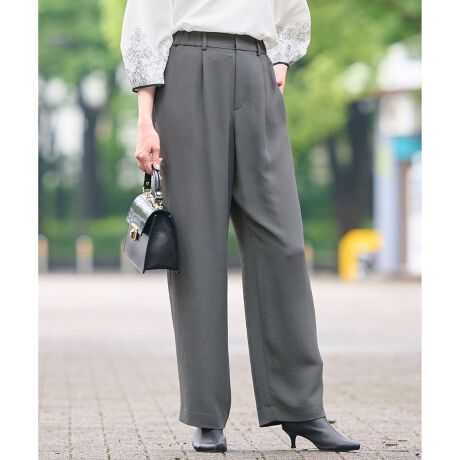 シルエットにこだわった抜け感のある大人パンツ■デザイン裾をほんの少し細くし、脚の甲に裾が少したまる今年らしいバランス感のパンツです。ウエスト部分に多めのゴムギャザーを入れたカジュアルなディティールを上品な素材で仕立てることで、大人の抜け感のあるパンツに仕上げました。緩くラフさを感じるデザインでありながら、バックサテンジョーゼットならではのしなやかなドレープ感でシルエットが美しく仕上がり、程よい肉感でボディラインを拾いにくいのがポイント。同素材のブルゾン(JKWRSA0305)と合わせてセットアップ風のコーディネートもおすすめです。■素材植物由来の環境にやさしい繊維として注目されているトリアセテート糸を使用した、ソフトでふくらみ感のある程よい肉感のバックサテンジョーゼットです。上品な光沢やドレープの出るエレガントな素材ですが、タテ・ヨコ共にナチュラルなストレッチ性のあるウーリー糸を使用しているため快適な着心地です。速乾性があり水洗いが可能な、日常使いしやすい素材です。
