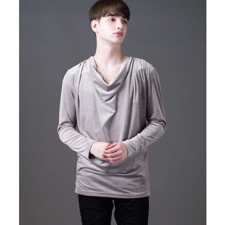 手触りの良いベロアテレコ素材で、着用感の良いドレープネックロングTシャツに仕上げました。
