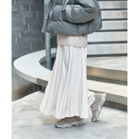 まるでスエードのような表面の細かな起毛感がポイントのサテン素材を使用したロングスカート。