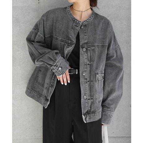 オーバーサイズ ノーカラー デニム ツイル ジャケット
