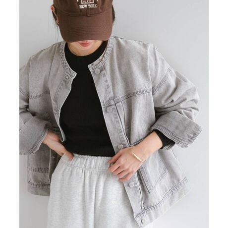 オーバーサイズ ノーカラー デニム ツイル ジャケット