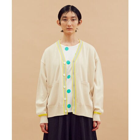ややゆとりが有りながらもスッキリとしたシルエットのカーディガンはフロントの前たてと袖口に入った配色がポイント。袖口や裾口のリブの編み地に変化をつけることで立体的な柄のようなポイントをつくっていたり、しっかりとポケットがついていたりと、シンプルな中にも程よいデザイン性を入れ込み合わせやすい羽織りアイテムになっています。