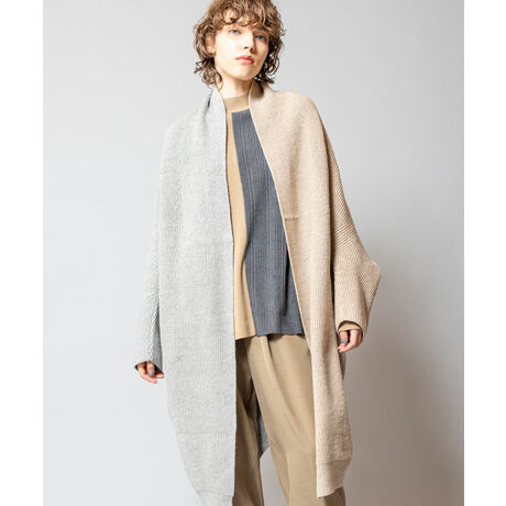 着丈の長さと襟元のデザインが変化する、2WAY仕様のニットアウター。落ち着きのある配色でどんなコーデにもマッチしやすい。