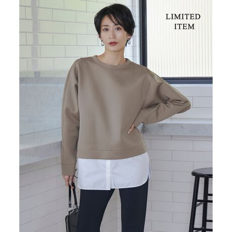 ■デザイン袖にゆとりをもたせ、身巾はゆったりとしたシルエットのシャツコンビプルオーバーです。短め丈からシャツをレイヤードした様なデザインで、カフスディテールにも凝った袖口がポイントです。デザイン性がありながらも、着心地の軽さと身体のラインを拾わないスタイリッシュに見えるシルエットが特徴のおすすめの一枚です。同シリーズのスカートとセットアップで着用すると、大人っぽいスタイリングに仕上がります。