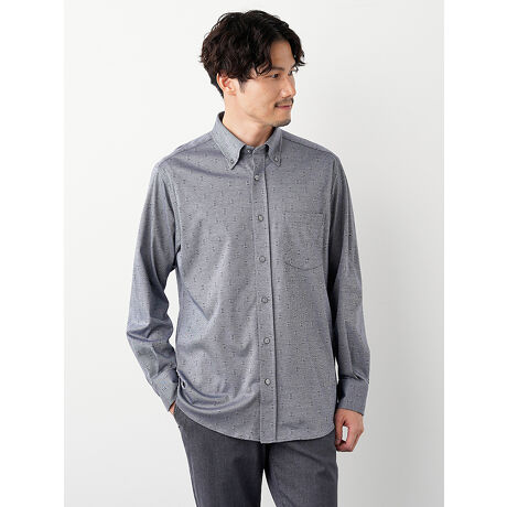 きめ細かくしっかりと編立られた小紋柄のジャージ生地を使用したボタンダウン長袖シャツ。綺麗な表情で、ジャージならではの伸びのある着用感が特徴の一着です。ビジネスシーンでも着用可能なサックス系とシックなグレー系の2色展開。キレイ目にジャケット合わせがお薦めですが、ジャージ特有の柔らかい表情もあり、ブルゾンやデニムまで幅広いコーディネートが可能です。