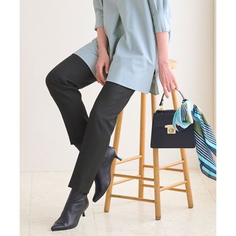 イージーケアなきれいめテーパードパンツ■デザインタック入りのテーパードパンツです。ヒップから太ももあたりは程よくゆとりがありながらも、裾に向かって細くなり、脚のラインがすっきりと見えるデザインです。シンプルでありながらも単調に見えない素材感のため、同素材のブラウス(BLW7SA0203)とセットアップでの着用はもちろん、様々なトップスに合わせやすいパンツです。■素材程よい凹凸感のあるハニカム組織が天然素材のような印象のポリエステル素材です。ドライな糸を使用しているのでシャリ感があり、サラッとしたタッチが心地よく、シワになりにくく、速乾性があります。