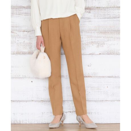 イージーケアなきれいめテーパードパンツ■デザインタック入りのテーパードパンツです。ヒップから太ももあたりは程よくゆとりがありながらも、裾に向かって細くなり、脚のラインがすっきりと見えるデザインです。シンプルでありながらも単調に見えない素材感のため、同素材のブラウス(BLW7SA0203)とセットアップでの着用はもちろん、様々なトップスに合わせやすいパンツです。■素材程よい凹凸感のあるハニカム組織が天然素材のような印象のポリエステル素材です。ドライな糸を使用しているのでシャリ感があり、サラッとしたタッチが心地よく、シワになりにくく、速乾性があります。