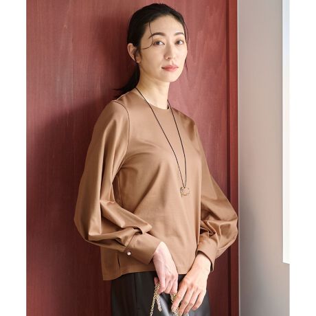 パフスリーブが華やかな万能トップス■デザインシンプルながらもボリュームのあるパフスリーブが華やかなトップスです。カフスにはパール釦がついており、1枚でも女性らしく華やかに着れますが、ジレのインナーに合わせたり、レイヤードスタイルにも幅広く活躍する万能なトップスです。■素材天然綿100%を使用し高密度に編立て、しっかりとしたタッチで安定感のある素材です。身体のラインを拾いにくい程よい厚みで、ストレッチ性に優れ、高密度の編立てにより洗濯後の型崩れも起こりにくいのがポイント。汗をかいても肌離れが良く、ストレスフリーな素材です。