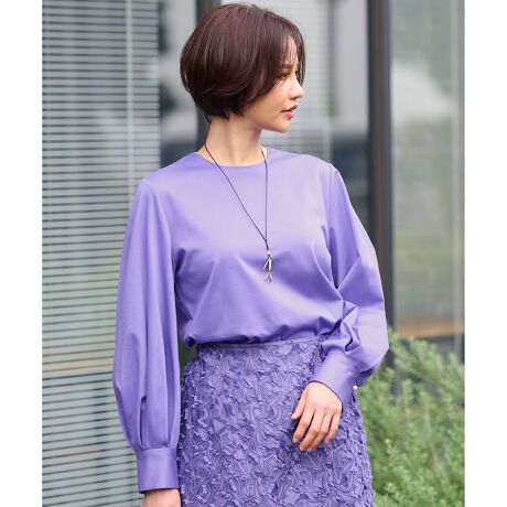 パフスリーブが華やかな万能トップス■デザインシンプルながらもボリュームのあるパフスリーブが華やかなトップスです。カフスにはパール釦がついており、1枚でも女性らしく華やかに着れますが、ジレのインナーに合わせたり、レイヤードスタイルにも幅広く活躍する万能なトップスです。■素材天然綿100%を使用し高密度に編立て、しっかりとしたタッチで安定感のある素材です。身体のラインを拾いにくい程よい厚みで、ストレッチ性に優れ、高密度の編立てにより洗濯後の型崩れも起こりにくいのがポイント。汗をかいても肌離れが良く、ストレスフリーな素材です。