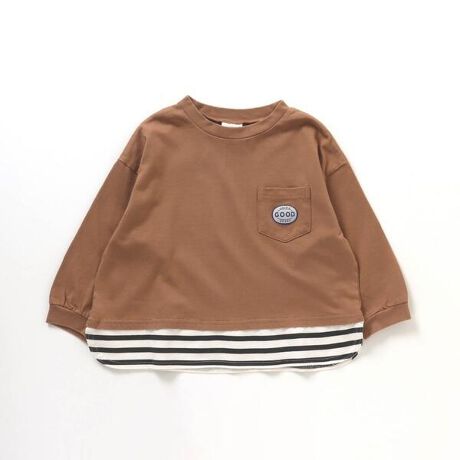 これ1枚で重ね着風コーデが完成するレイヤード風のロングTシャツ☆前面は胸元のポケットのワンポイントデザインですが背面の大きなロゴが目を引くお洒落なアイテム♪どんなパンツとも相性抜群でこれ1枚でサラッとおしゃれが実現しママさんもうれしい長袖Tシャツです◎