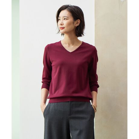 シンプルで凛とした印象の、人気のVネックニット。パイピングで繊細に仕上げた、安心感のある開きすぎない衿開きは、着る人を選ばず品よく着ていただけます。スカートとパンツのどちらとも好相性で、きちんと感があるキレイな表面感のためジャケットのインナーとしても大活躍。合わせるアイテムによって、秋口から季節を跨いで長い期間着用できます。