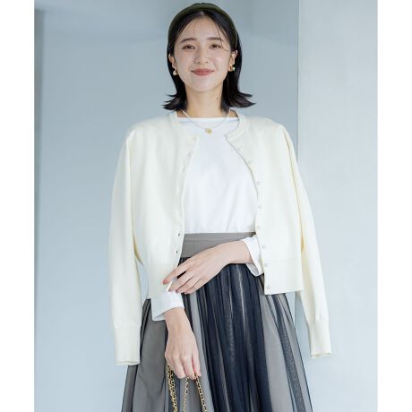 ■デザイン小さな襟とコンパクトな着丈がシックでモダンなカーディガン。首や肩が美しく見える絶妙なサイズ感と、少し多めにつけたパール釦は、シンプルなデザインのチャームポイント。釦を全部留めてプルオーバーのように着るのもおススメです。