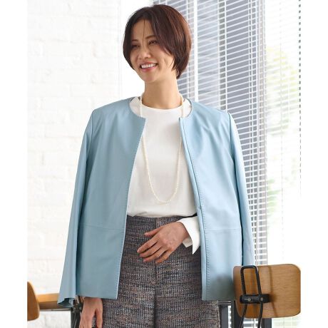 カーディガン感覚で羽織れる上質なレザージャケット■デザインボクシーなシルエットのノーカラージャケットです。衿ぐりはやや詰まったコンパクトなクルーネックで、袖口が少し広がりのあるシンプルなデザインでありながらもトレンド感を感じられます。タイトではなく、程よくゆとりをもたせたシルエットで、カーディガンのような感覚でさらっと羽織っていただけるデザインです。上質なレザーを厳選することで、しなやかさと軽さを実現したジャケットです。■素材きめ細やかでしっとりとした肌触りで、ナチュラルな風合いを保ちながら弾力性を併せ持ち、染色後に通常より薄いコーティングを施す事で、自然で柔らかな風合いに仕上げたレザー素材です。厳選された原皮は1枚1枚性質や表情が異なりますが、職人の手によって整えられることにより、着用すると体になじみ、着やすさを実感できます。■同素材アイテムスカート(SKW7SA0306)