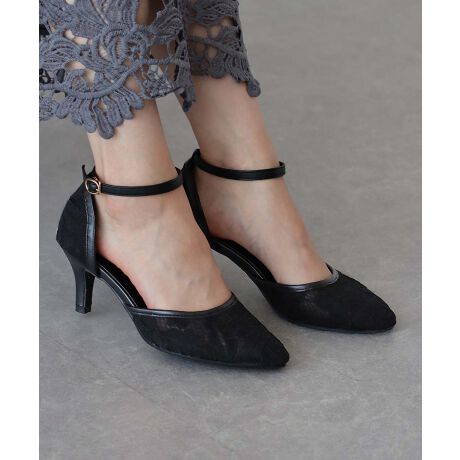 フラワーレースの刺繍がレディライクなポインテッドトゥのヒールパンプス