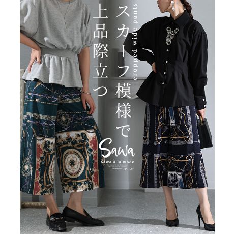 スカーフ模様のクロップドワイドパンツです。コーデにエレガントな雰囲気をプラスするスカーフ模様映えるパンツの登場です。