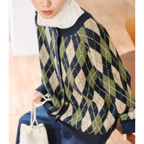 大人でも着こなしやすいアーガイル柄でお洒落に見せつつ、ナチュラルな雰囲気を演出。