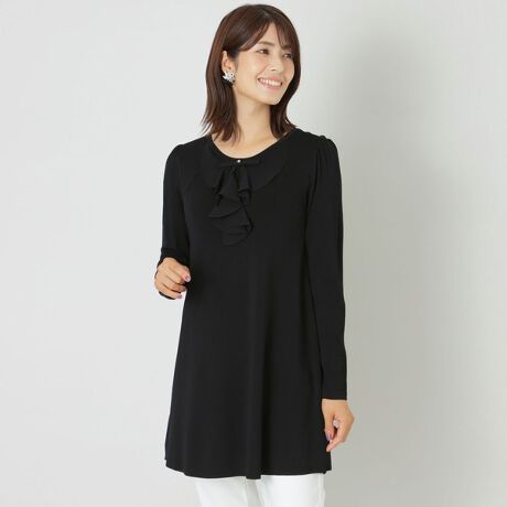 配色襟のラッフルフリル、リボン、ビジューの組み合わせがTO BE CHICらしく、大人かわいいニットチュニックです。