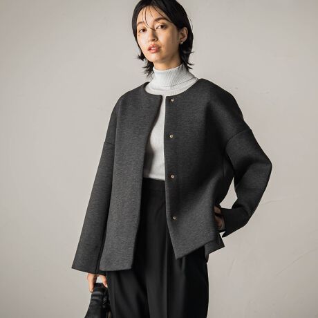 デイリーからきちんとしたシーンまで使える、ミニマムなデザインのノーカラージャケット。